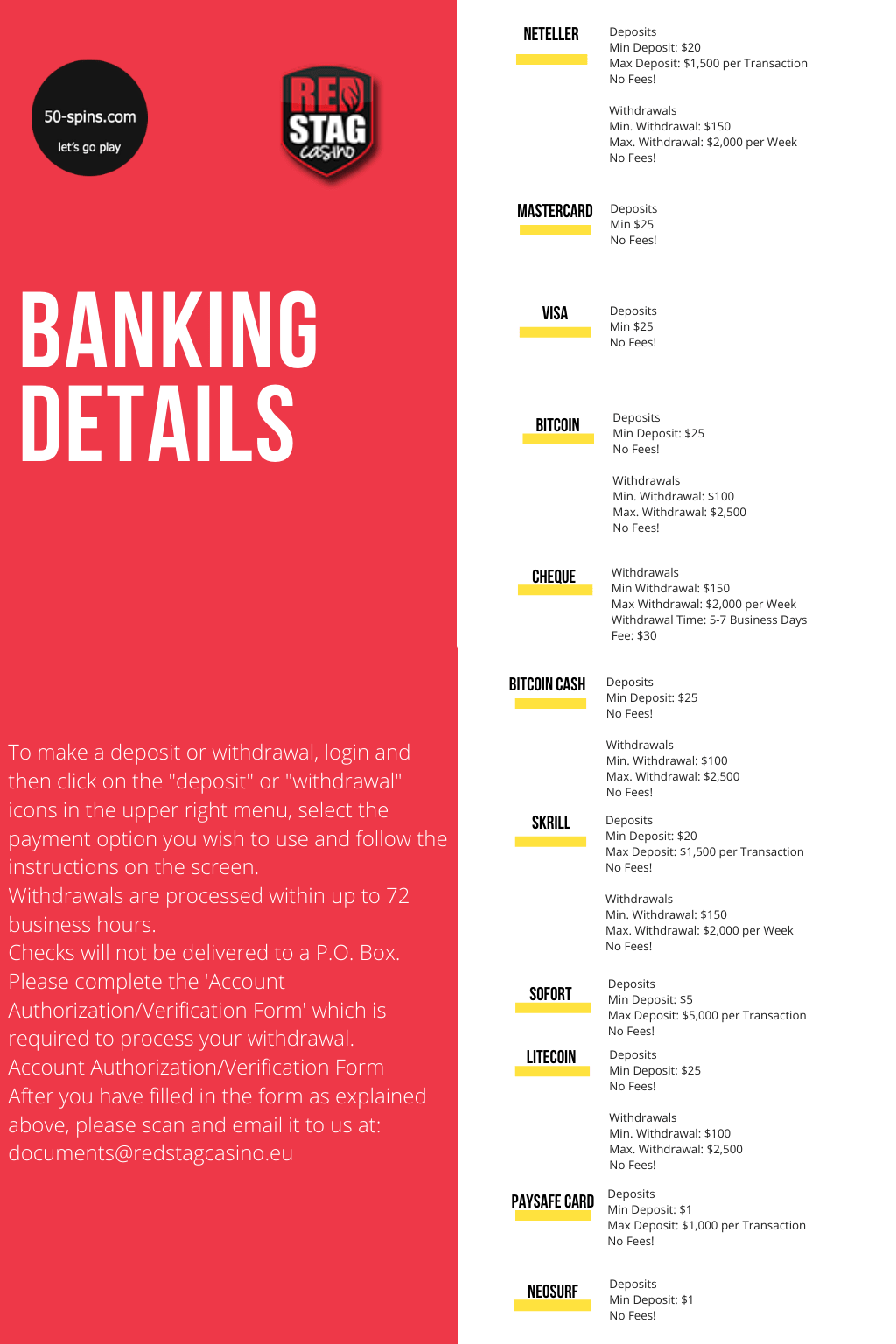 Le montant minimum pour un dépôt est de 10 euros, tandis qu’un minimum de 20 euros est requis pour un retrait. Tous les paiements sont effectués sous sept jours maximum, après un délai d’attente de 24 heures. Le moyen le plus rapide de recevoir vos paiements est de les demander via un portefeuille électronique. Le délai de paiement ci-dessous est d’un jour maximum. Les retraits par carte Paysafe et CashtoCode ne sont pas possibles. Vous devez utiliser une autre méthode de paiement, déjà approuvée.
